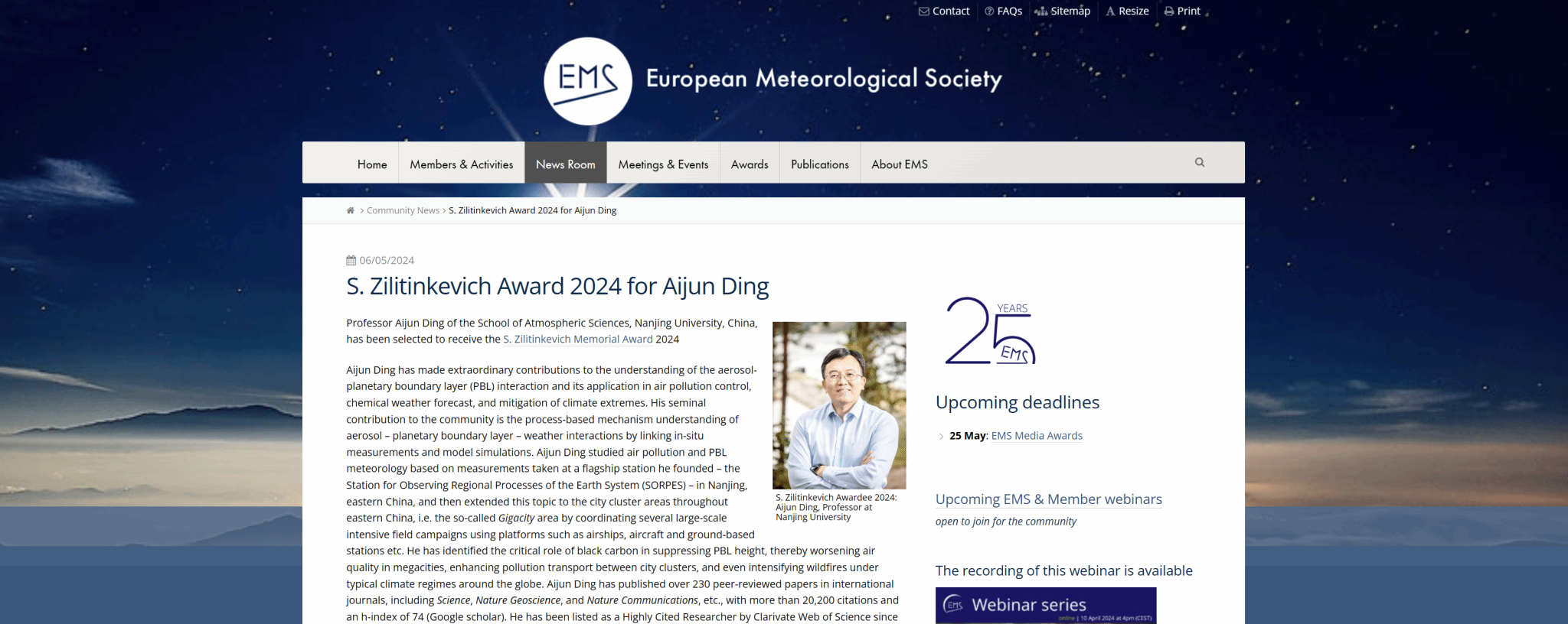 近日,欧洲气象学会宣布,2024年度Zilitinkevich奖(全称Sergej Zilitinkevich Memorial Award)将授予我校丁爱军教授,以表彰他“在理解气溶胶-大气边界层相互作用及其在大气污染防治、化学天气预报及气候极端事件减缓等方面应用的突出贡献”,以及他“结合外场观测和数值模拟,针对气溶胶-边界层-天气相互作用问题基于过程的机制认识方面开创性的贡献”。该奖颁奖仪式将于9月在西班牙巴塞罗那召开的欧洲气象学会2024年会举行,届时丁爱军将出席颁奖仪式并作特邀报告。