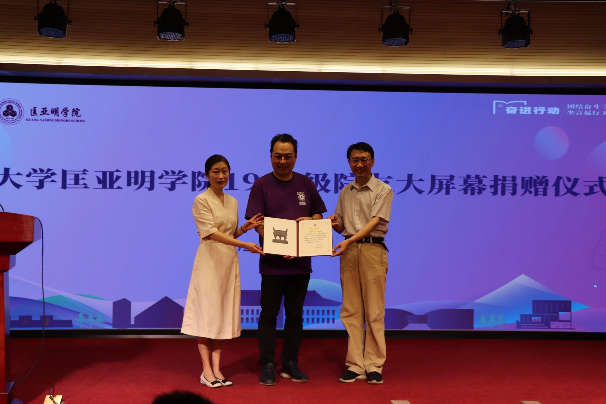 王骏、周媛向院友代表洪浩颁发感谢状。院友代表共同上台,为大屏幕揭幕。