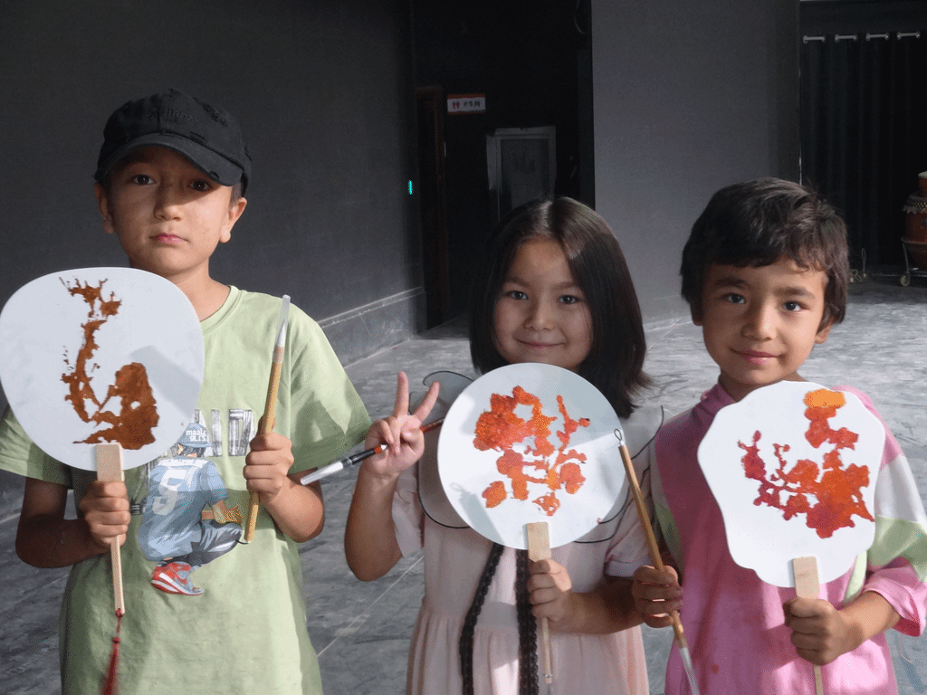 在近两个小时的创作过程中,师生们耐心讲解烧箔画技艺,手把手带着孩子们描绘石榴、梅花、兰花等图案。看着手中的团扇从最初的空白逐渐变成一幅幅绚烂多彩的艺术作品,孩子们非常开心。