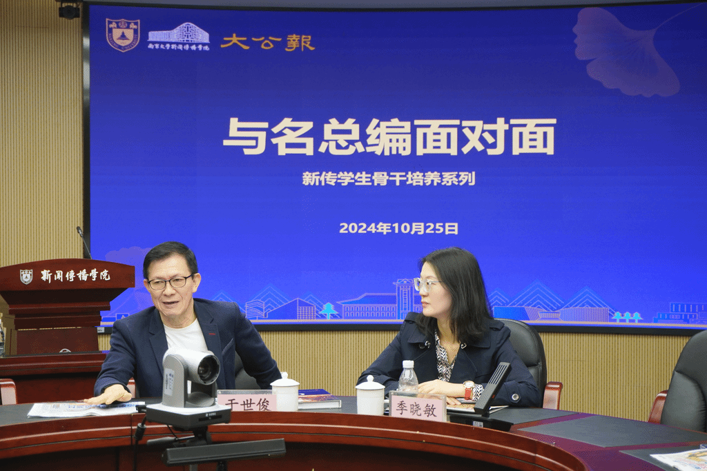10月25日下午,新闻传播学院学生骨干培养系列座谈会“与名总编面对面”在紫金楼456会议室举行,香港《大公报》总编辑、凯发k8官网客座教授于世俊应邀出席座谈会,新闻传播学院党委副书记季晓敏、专任教师宗益祥、王啸及40余名学生参与了此次交流。本次座谈会由季晓敏主持。