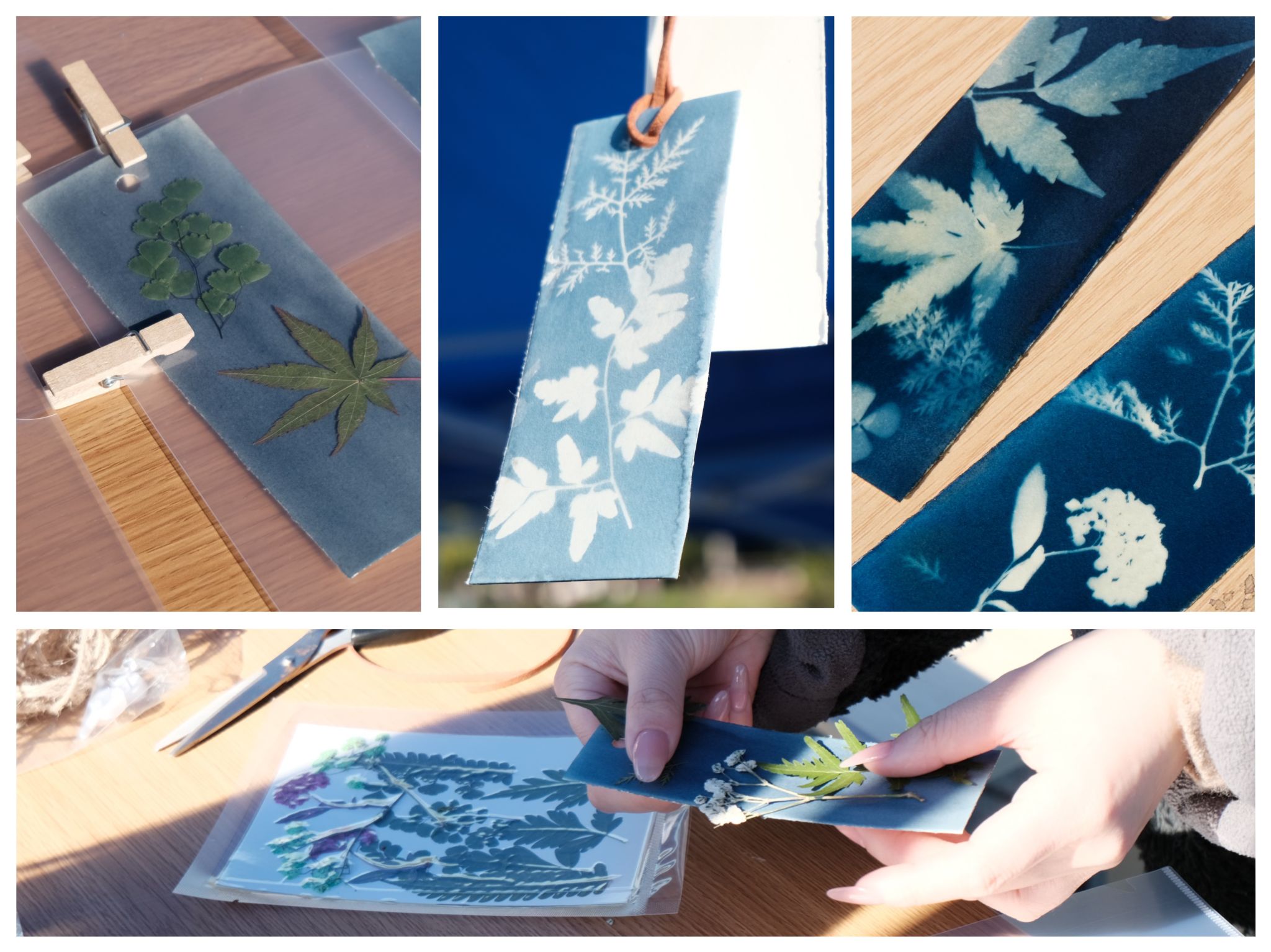 在现场的另一处,“蓝晒书签”展台用蓝晒技术用阳光与植物交织出富有诗意的作品,在光影间将自然定格成永恒。活动中,参与者不仅能学习蓝晒技术的原理,还能亲手制作属于自己的专属书签,感受紫外线下奇妙的成像过程。 参与者通过挑选树叶、花朵等自然素材,利用户外紫外线晾晒然后冲洗呈相,将阳光与植物交融刻画出自然的影像。在蓝晒书签展台,每片叶都将化作书签上的艺术符号,记录同学们与自然的共鸣。